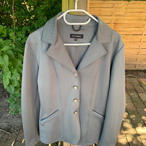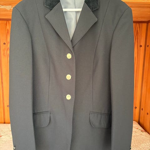 Montar stævneridejakke i sort til dame i str. 36. Jakken har klassisk reverskrave og lukkes med knapper foran. Ærmerne har knaplukning ved manchetterne. Der er diskret Montar-logo broderet ved lommen samt dekorativt broderi på ærmet. Jakken er figursyet med indsnit for en kropsnær pasform og har en glat bagside med slids forneden for bevægelsesfrihed i sadlen.
