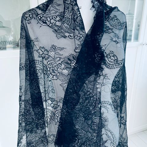 Sort blonde stof 2x2 m. Stoffet har gennemgående blondemønster og en dekorativ bølget kant med blomstermotiv langs siden. Egnet til syning af tøj, accessories eller dekoration, hvor der ønskes et gennembrudt blondelook.