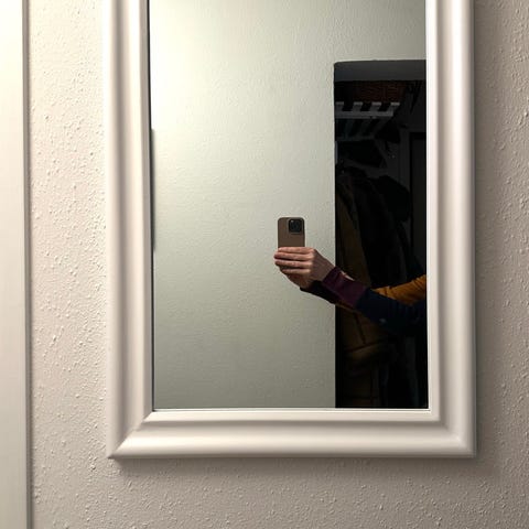 IKEA spejl i hvid ramme. Rektangulært spejl i fuld længde, velegnet til ophængning på væg i entre, soveværelse eller garderobe. Enkel, smal ramme i lys farve, der passer ind i de fleste indretninger.