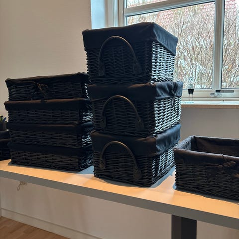 IKEA flettede opbevaringskurve med låg i sæt. Kurvene er lavet i naturflet og kommer i flere størrelser, som kan stables eller sættes ind i hinanden. Hver kurv har tilhørende låg med lille knop øverst. Egnet til opbevaring af mindre ting som legetøj, tøjtilbehør eller andre småting i hjemmet eller børneværelset.