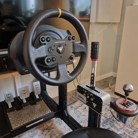 Thrustmaster T150 rat og pedaler til brug med racingstol. Rattet har sort og blå belægning og flere funktionsknapper på fronten. Pedalenheden har to pedaler og er monteret på en base. Sættet er monteret på en justerbar racingstol med metalstel og polstret sæde. Velegnet til brug med racingspil, hvor der ønskes mere realistisk styring med rat og pedaler.