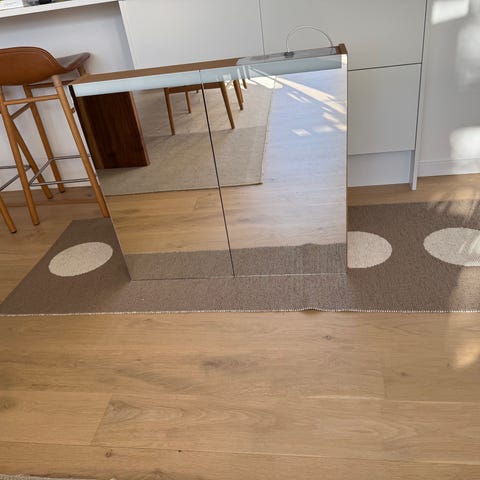 Det asymmetriske spejl i rustfrit stål skjuler elegant det funktionelle spejlskab. Brug hylderne i Shard Mirror Cabinet til at opbevare produkter på badeværelset eller til mindre genstande som nøgler eller andre personlige småting ude i gangen.
