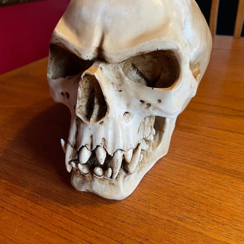 The Dead South dekorativt kohoved kranie med horn. Kraniet er lyst med mørkere horn og har indgraveret teksten "The Dead South" på panden. Velegnet som væg- eller rumsdekoration i fx stue, musikrum eller barområde. Materialet fremstår som et naturtro kranie med faste horn monteret på hovedet.