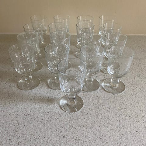 Glas, diverse glas, Holmegaard Mazurka, 16 snaps a 20 kr, 5 hvidvin a 40 kr, 10 rødvin a 50 kr og 10 øl a 60 kr