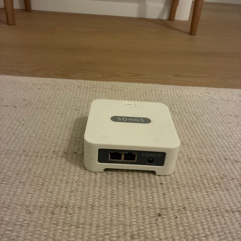 Ubrugt Sonos Boost trådløs netværksenhed i hvid. Enheden er designet til at forbedre det trådløse signal til Sonos-højttalere og -komponenter i hjemmet. Boost opretter et dedikeret trådløst netværk til Sonos-systemet for mere stabil forbindelse, især i hjem med udfordrende WiFi-dækning. Enheden tilsluttes typisk routeren via netværkskabel og placeres et centralt sted i boligen. Velegnet til brug sammen med eksisterende Sonos-højttalere og -afspillere for at sikre mere pålidelig streaming i flere rum.