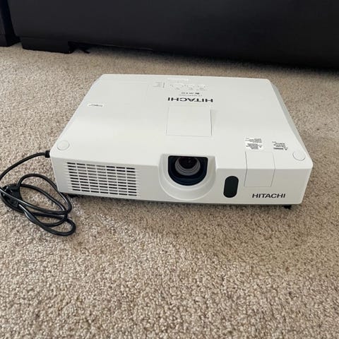 Hitachi CP-XW300N projektor i hvid. Projektoren er beregnet til visning af billede og video via flere tilslutningsmuligheder, herunder VGA, komposit og andre standard videoindgange. Enheden egner sig til brug i mødelokaler, undervisningslokaler eller hjemme, hvor der er behov for projektion på lærred eller væg. Modellen har manuelle kontroller på toppen til bl.a. fokus og zoom samt indikatorlamper for driftstilstand.