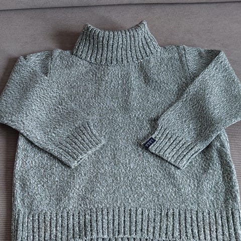 Striktrøje med V-hals. Mærket er klippet ud. Føles som bomuld. Farven er nok nærmest olivengrøn meleret. Se også mine andre annoncer:)