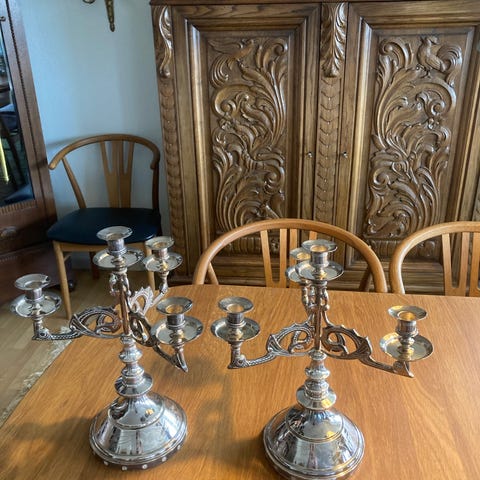 Oxyderet pletsølv lysestage i klassisk, ornamenteret design. Lysestagen har en tung, profileret fod med dekorative detaljer.