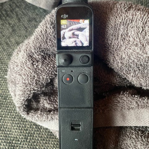 DJI Osmo Pocket kamera i sort. Kompakt håndholdt kamera med indbygget gimbal og lille farveskærm til visning og betjening. Kameraet har betjeningsknapper på fronten og håndledsrem for ekstra sikkerhed. Medfølgende stativ/greb kan foldes ud som små ben til bordplacering eller bruges som forlænget håndtag. Velegnet til videooptagelse og vlog-lignende brug, hvor der er behov for stabiliserede optagelser i et lille format.