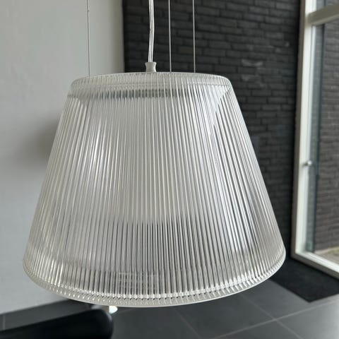 Flos Philippe Starck pendel lampe i gennemsigtig plastskærm med riflet overflade. Lampen er ophængt i wirer og ledning fra loftet og giver nedadrettet belysning, egnet til brug over spisebord, køkkenbord eller i opholdsrum. Designet kombinerer funktionel belysning med et enkelt, moderne udtryk.