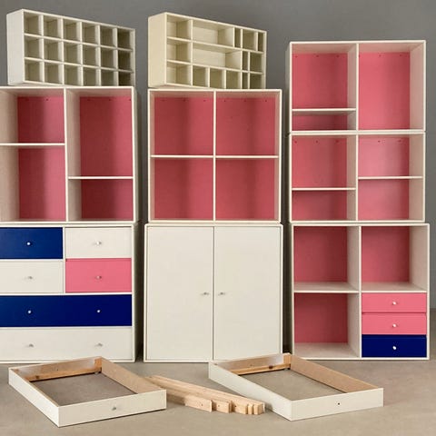 To store skabe, to små skabe, resten åbent.