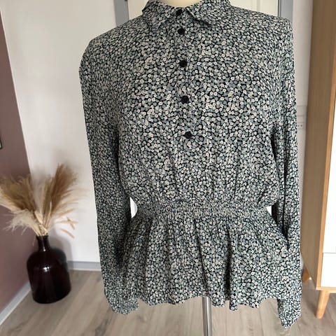 MbyM sort bluse med peplum-effekt og ballonærmer str. L.
