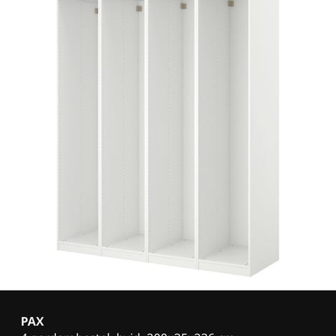 Pax skab med rigtig god plads til opbevaring. Meget fin stand. 3 år gammelt. Består at modul på 100 cm og et på 50 cm. Der er hylder i begge sider. Med Forsand låger.