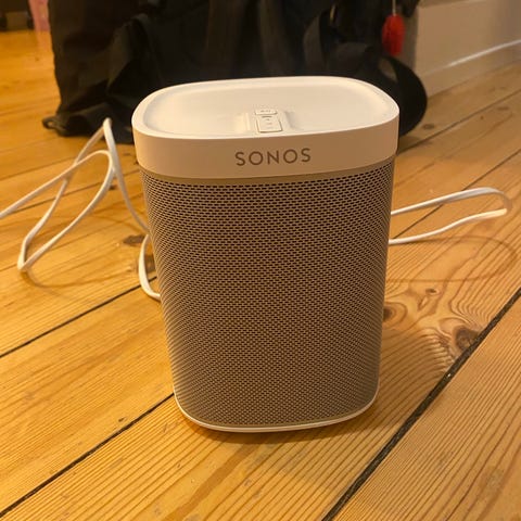 Sonos Play:1 trådløs højttaler i sort. Kompakt netværkshøjttaler til brug med Sonos-systemet. Enheden har betjeningsknapper på toppen til lydstyrke og afspilning. Højttaleren kan placeres på hylde eller monteres på væg med passende beslag. Tilsluttes strøm via medfølgende strømkabel og styres via Sonos-app på kompatible enheder.