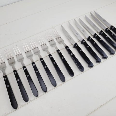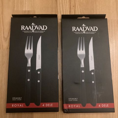 2 sæt Raadvad Royal steakbestik sæt med 4 dele. Det består af steakknive og gafler med sort skaft. Knivene har skarpe mikro-takker, der er velegnede til udskæring af kød. Bestikket er fremstillet i rustfrit stål og leveres i original æske. Brugt et par gange. Sælges samlet.