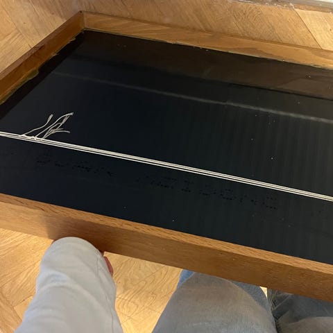 Firkantet spejl med sort kant 70 cm × 70 cm. Kan hentes I herlev eller på Østerbro.