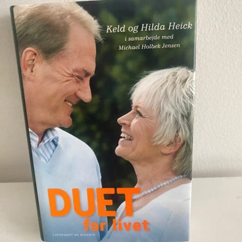 Keld og Hilda Heick "Duet for livet" bog. Indbundet udgave med titel på ryggen og foto af forfatterne på forsiden. Bogen er udgivet på forlaget LR og omhandler Keld og Hilda Heicks liv og karriere beskrevet i tekst og billeder.
