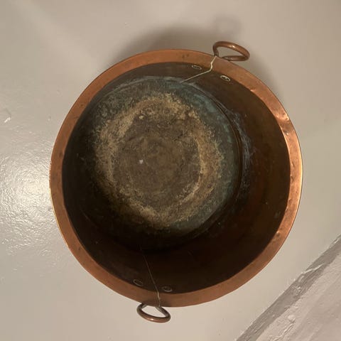 Smuk og irret kobberkeddel. Har brugt den både til brænde og til stor stueplante. Jeg har givet kr 2.000,- for den for 8 år siden.