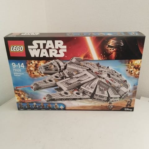 LEGO Star Wars Millennium Falcon byggesæt. Sættet forestiller rumskibet Millennium Falcon fra Star Wars-universet i grå nuancer med detaljer i blandt andet mørkegrå, sort og rød. Modellen består af et større rumskib med cockpit, bevægelige paneler og indrettet interiør med forskellige kontrolstationer og opholdsområder. Sættet leveres med original æske og byggevejledning, som vist på billederne. Velegnet til opbygning, leg og udstilling for fans af LEGO og Star Wars. Alle dele.