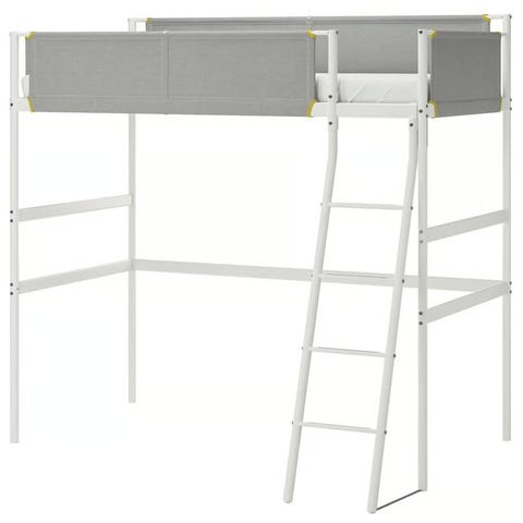 IKEA højseng i hvid metal med stige i siden. Sengen er hævet, så der er god plads under sengen til fx sofa, skrivebord eller opbevaring. Siderne omkring madrassen er udstyret med tekstilpaneler for afskærmning. Konstruktionen består af en metalramme med ben, der giver fri gulvplads under sengen. Velegnet til et værelse, hvor man ønsker at udnytte højden i rummet og kombinere soveplads med opholds- eller arbejdsområde.