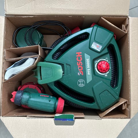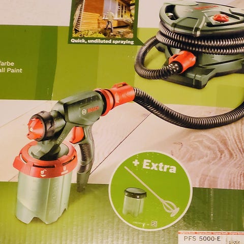 Bosch PFS 5000 E malersprøjte i grøn. Systemet består af hovedenhed med bærehåndtag og integreret slange, sprøjtepistol samt beholder til maling eller lak. Velegnet til sprøjtning af maling, lak og træbeskyttelse på fx vægge, lofter, møbler og træværk. Elektrisk sprøjtesystem til gør‑det‑selv opgaver i hjem og have.