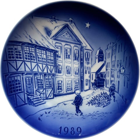 Desiree Jubilee Plate porcelænstallerken med motiv af Hans Christian Andersens hus. Tallerkenen er udført i blå og hvid porcelæn og markerer perioden 1970-1980. Forsiden viser et vintermotiv med sneklædte huse, gadelygte og person med juletræer, mens bagsiden er mærket med producentens logo og teksten "Jubilee Plate 1970-1980 Hans Christian Andersen's House". Velegnet som samlerobjekt eller vægdekoration.