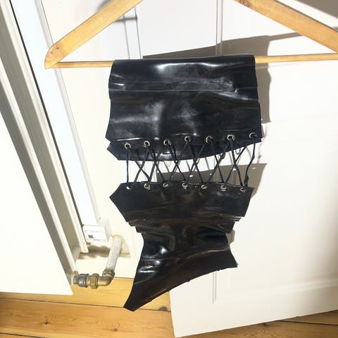 Latex strømper med fløde farve. til fødder og er fremstillet i glat latexmateriale. Egnet til brug, hvor en tæt og vandafvisende beklædning ønskes, fx til fetish- eller kostumebruk. Størrelse M, godt brugte & beskidte & lugtende 😣