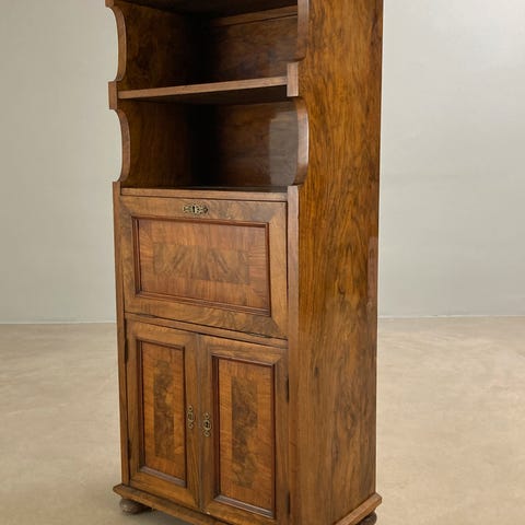 Skab i valnøddetræ med én øverste skuffe, låge og indvendige hylder. Skabet har fineret front og klassiske metalgreb. Indvendigt er der flere hylder, som kan bruges til opbevaring, Egnet som opbevaringsmøbel i stue, spisestue køkken eller entré.