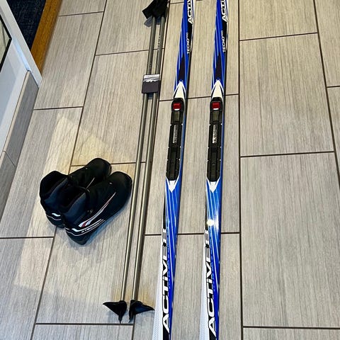 Sættet har stået tørt og pænt og ventet på sne, motivation og måske et nyt liv hos en mand mellem 180 og 195 cm og skostørrelse 44-45, der rent faktisk gider at løbe på ski. Fremstår i rigtig flot stand. Vi vil gerne sælge det samlet: Ski, bindinger, støvler og staver.