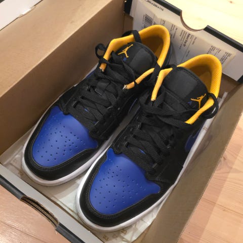 Air Jordan sneakers i størrelse 45. Skoene er i en blå og hvid farvekombination med lavt skaft. Overdelen har perforeret tåparti og klassisk snørelukning. Ydersålen er mønstret gummi, som giver godt fodfæste. Velegnet som hverdagssko og fritidssko.
