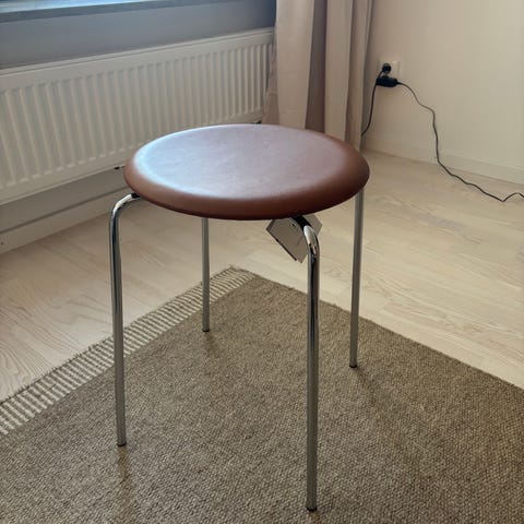 Fritz Hansen Arne Jacobsen skammel med rundt sæde i valnød og ben i krom. Virkelig fin og klassisk ekstra siddeplads. Skamlen er let brugt men minimalt slid - se billeder.