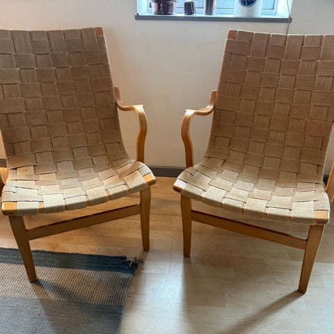 Eva lænestol i bøg/lak og sæde af flettet gjorde i natur. Designet af Bruno Mathsson, som er en svensk arkitekt og møbeldesigner.