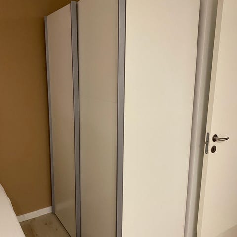 Garderobeskab med skydelåger og 10 justerbare hylder.