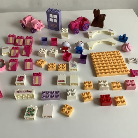 Lego Duplo, Hello Kitty, Sælger alt det her Hello Kitty lego, som har samne størrelse og form som Lego duplo. Klodserne er i flotte pastelfarver og stærke pigefarver.