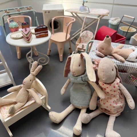 Alex og Fox dukkehus med tilbehør fra Maileg, heriblandt 3 kaniner og en mus.