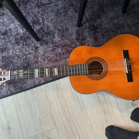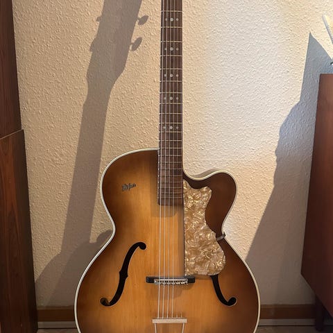 Sælger denne gamle akustiske guitar i klassisk jazz/archtop-stil. Den har et smukt naturligt træfinish, dekorative f-huller og et karakteristisk vintage udtryk. Perfekt til dig der samler eller ønsker et unikt instrument med historie.
