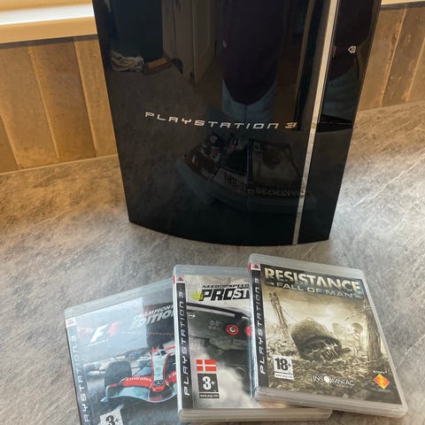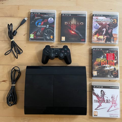 Sony Playstation 3 konsol med tilhørende strømkabel og to trådløse controllere. Medfølgende fysiske spil, herunder blandt andet Diablo III, The Last of Us, Assassin’s Creed og andre titler som vist på billedet.
