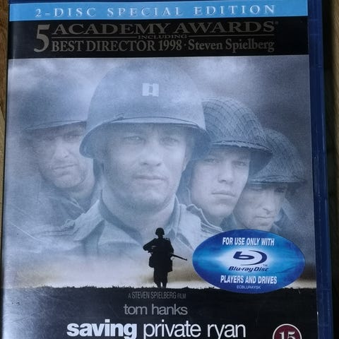 Saving Private Ryan 2-disc special edition Blu-ray. Udgaven indeholder filmen på Blu-ray fordelt på 2 discs. Forsiden angiver aldersgrænse 15 år (BBFC 15). Oplagt til samlere af krigsfilm og Blu-ray udgaver med ekstra materiale, hvor tilgængeligt på denne version.