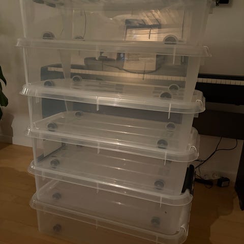 IKEA bed-roller, der passer ind under boksmadras på ben. Den er 97 cm bred (der hvor håndtagene er) og 92 cm lang. 20 cm høj. Selve skuffens dybde er 13 cm. Følger gratis med boksmadrassen, jeg også sælger. Ellers koster den 40 kr.
