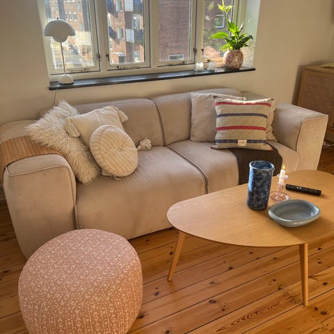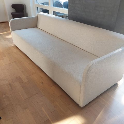Lounge sofa fra Fjord Interiør på Østerbro - cream farvet - måler 75 cm høj - 145 cm bred - sidderhøjde 45 cm - materiale uld og viscose - Sofaen har bløde, afrundede former med høj ryg og integrerede armlæn. Den leveres med to løse ryghynder i samme lyse stof - nypris 11.000 kr - lidt over 3 år gammel - har ingen kvittering mere - brugt men i fin stand og sælges blot da vores dagligstue skal have et andet udtryk.