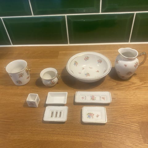 Lille sæt bestående af kande og skål i porcelæn. Begge dele er hvide med blå, svungne dekorationer langs kanter og sider. Skålen har rillet kant og en mindre afskalning på kanten, som ses på billedet. Kanden har hank og hældetud og passer i størrelse til skålen, så den kan stå i skålen. Velegnet som dekorationsgenstand eller til brug i fx badeværelse eller som pynt på hylde eller bord.