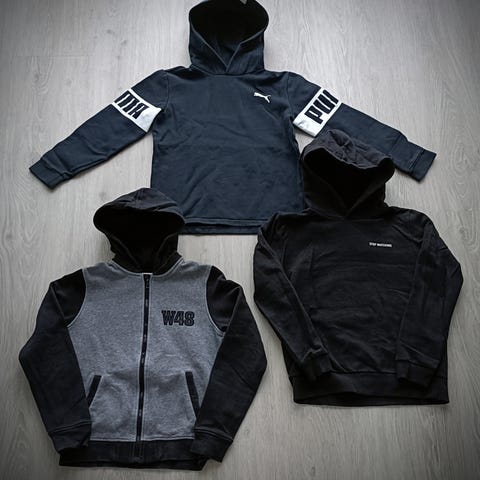 4 sorte sweatre/hoodies/hættetrøjer. Str. 146-152. Brugte men i god stand fra ikkerygerhjem uden husdyr. Kun vasket i Neutral. Kan sendes eller afhentes i Nørresundby. Prisen er pr. stk. ved køb af alle. Sælges også enkeltvis til 40,- pr. stk. Yderligere rabat gives gerne ved køb af flere af mine annoncer.