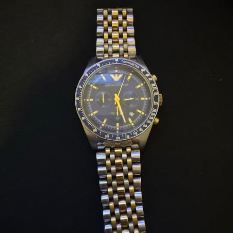 Armani herreur armbåndsur med kronograffunktion og datoangivelse. Uret har mørk urskive med tydelige timemarkeringer og tre små hjælpeskiver. Kassen og lænken er i metal med foldelås. Designet er egnet til mænd og kan bruges både til hverdag og mere formelle anledninger.