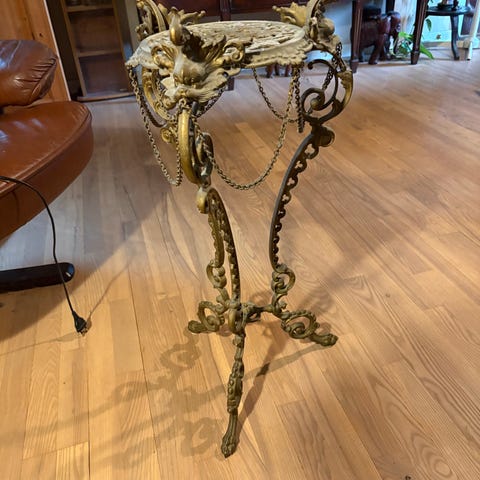 Fransk piedestal / Plantestander i træ med guldfarvet finish og hvid rektangulær hylde. Standeren har fire drejede ben og tre buede fødder. Øverste ramme er åben, fordi den mangler den øverste plade. Velegnet til at bære en plantekrukke eller dekorationsgenstand. Klassisk, slank model der kan placeres i stue, entré eller andre rum, hvor der ønskes en høj stander til planter eller pynt.