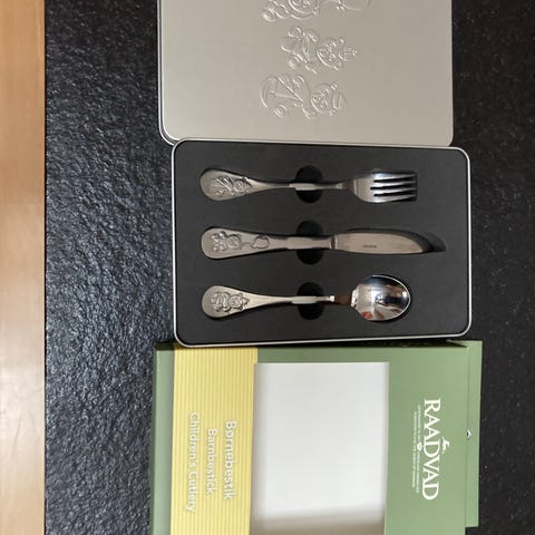 Et traditionelt/retro sæt til små børn bestående af tallerken, krus, ske og gaffel i rustfrit stål af mærket: Danish design. Sættet blev givet som dåbsgave (derfor intet prismærke), men modtagerne brød sig ikke om det, og det blev derfor aldrig brugt.