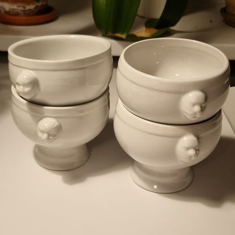 6 stk Løgsuppeskåle / skåle, Pillivuyt, 45 cl H: 7cm. & Ø: 13cm. Alle fremstår som nye, kun brugt få gange. Tåler høj varme op til 350 grader. Sælges kun samlet. Fra røgfrit hjem.