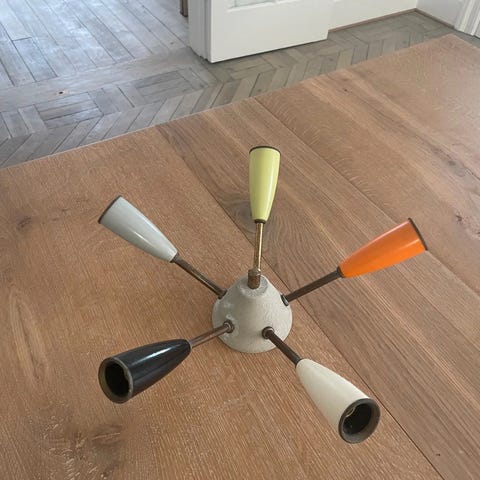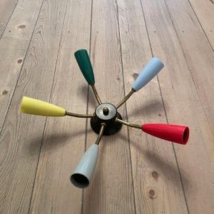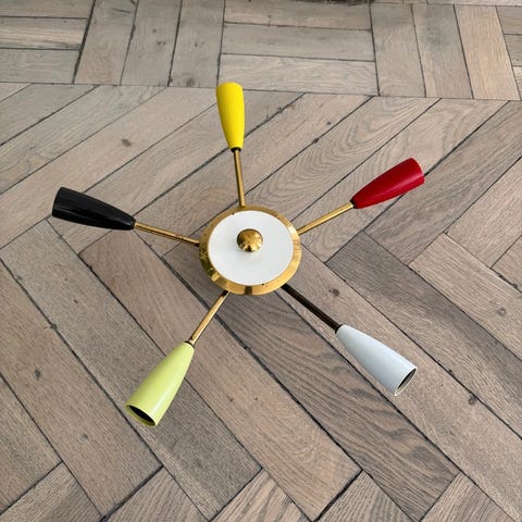 Den er udført i messing med 3 messing-arme med de oprindelige originale fatninger (e14 = lille fatning) i rød, gul og sort). Derudover 3 elegante tynde sorte metal stænger som dekoration.