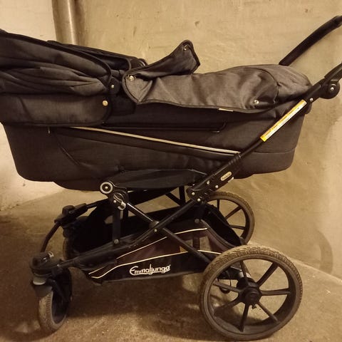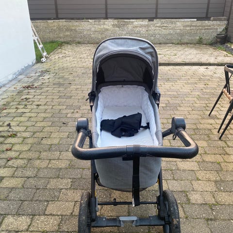 Barnevogn vi har brugt til dagplejen. Der er langt liggemål ca 92cm. Fra røg og dyrefrit hjem. Der er synlige brugsspor på håndtaget, men er ellers velholdt :) Pose under barnevogn til opbevaring medfølger. Den var bare ikke på, da vi tog billeder :)