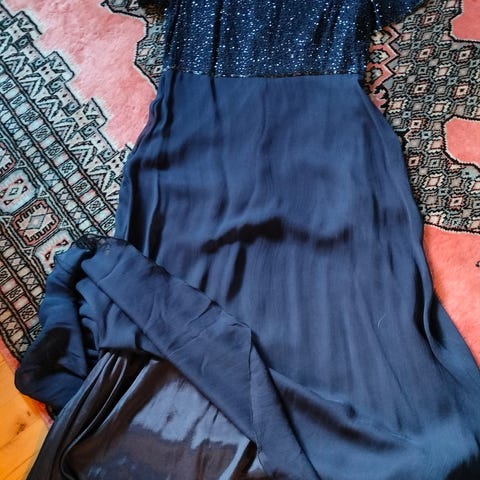 Arket kjole til særlige lejligheder til kvinder i størrelse L. Kjolen er blå og fremstillet i polyester. Modellen har lange ærmer og lang nederdel. Overdelen har dekorativt mønster og detaljer, som fremgår af billederne. Egnet til brug ved festlige og formelle lejligheder.