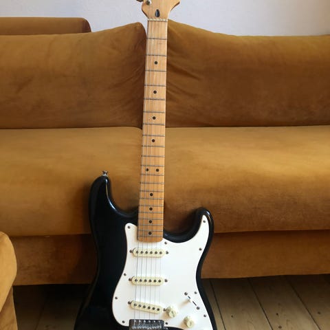 Fender Squier Stratocaster elektrisk guitar i klassisk Stratocaster‑form. Farven er sunburst med sort slagplade. Guitaren har tre single‑coil pickupper, volumen- og tonekontroller samt 5‑vejs pickupvælger. Monteret med tremolo-bro og standard stemmeskruer. Hals i træ med gribebræt i mørkt træ og dot-inlays. Velegnet som alsidig elektrisk guitar til mange musikgenrer.
